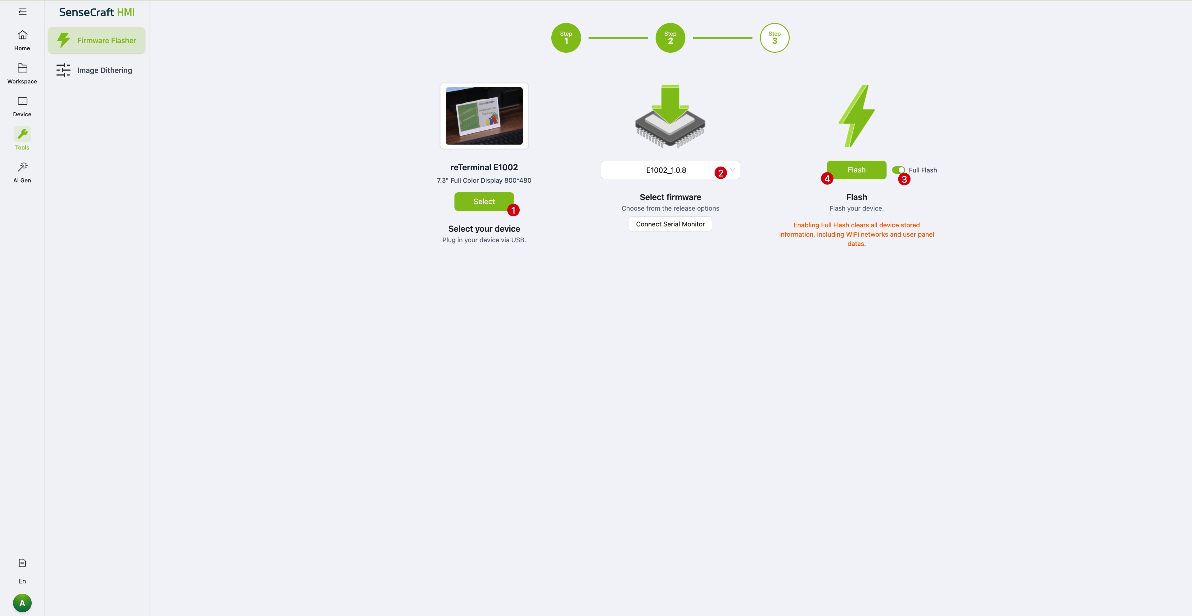 Our devices come pre-loaded with the standard HMI firmware. However, if you have experimented with third-party firmware (such as Home Assistant or Arduino) and wish to revert to the original factory state, use this tool.
