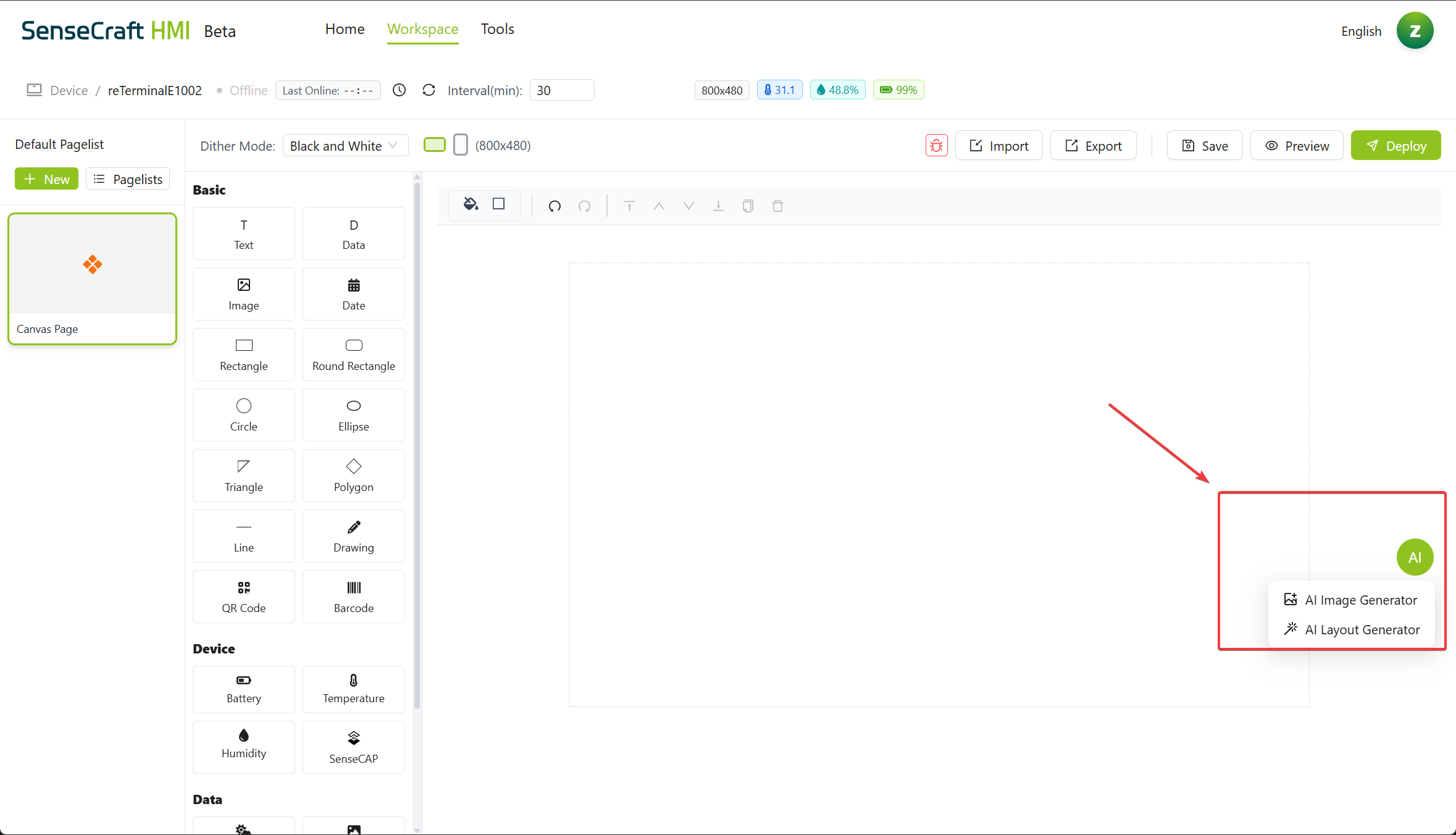Section titled “Getting Started”The AI Generation feature is available in both the Gallery and Canvas sections of SenseCraft HMI. Each implementation serves a different purpose: