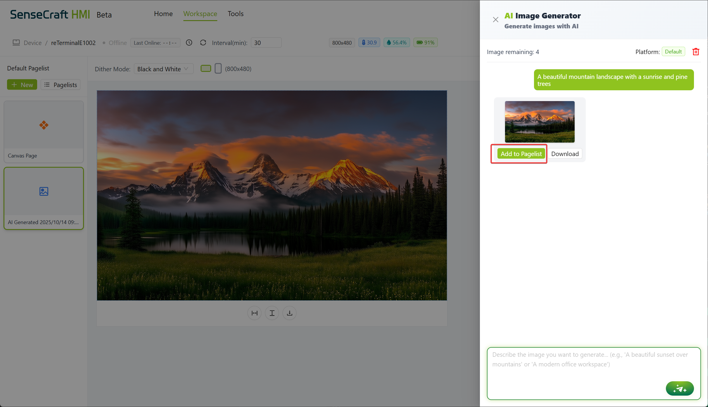 The AI generation function can be used in both the Image and Layout sections of the SenseCraft HMI. Each implementation method has its own specific application: