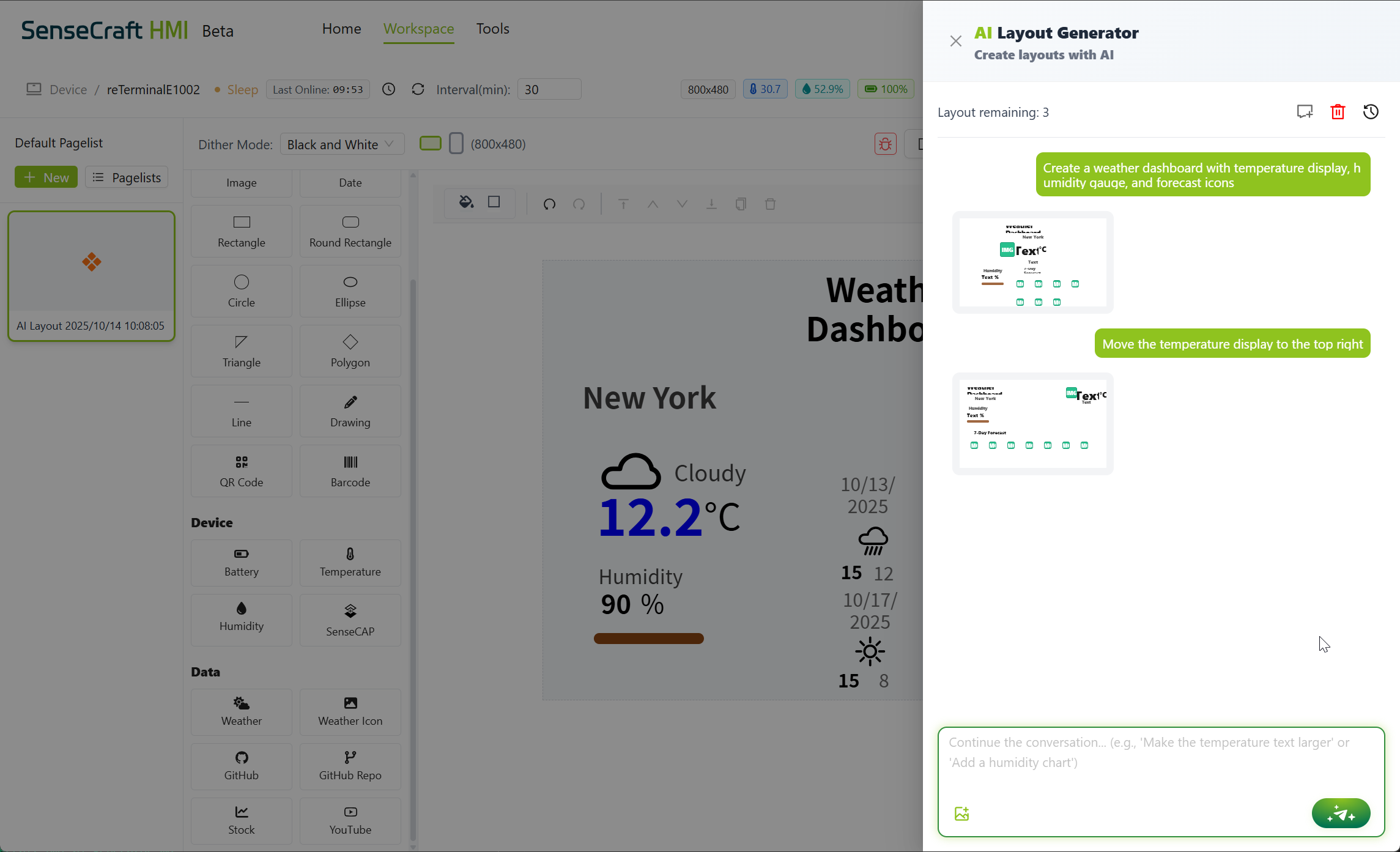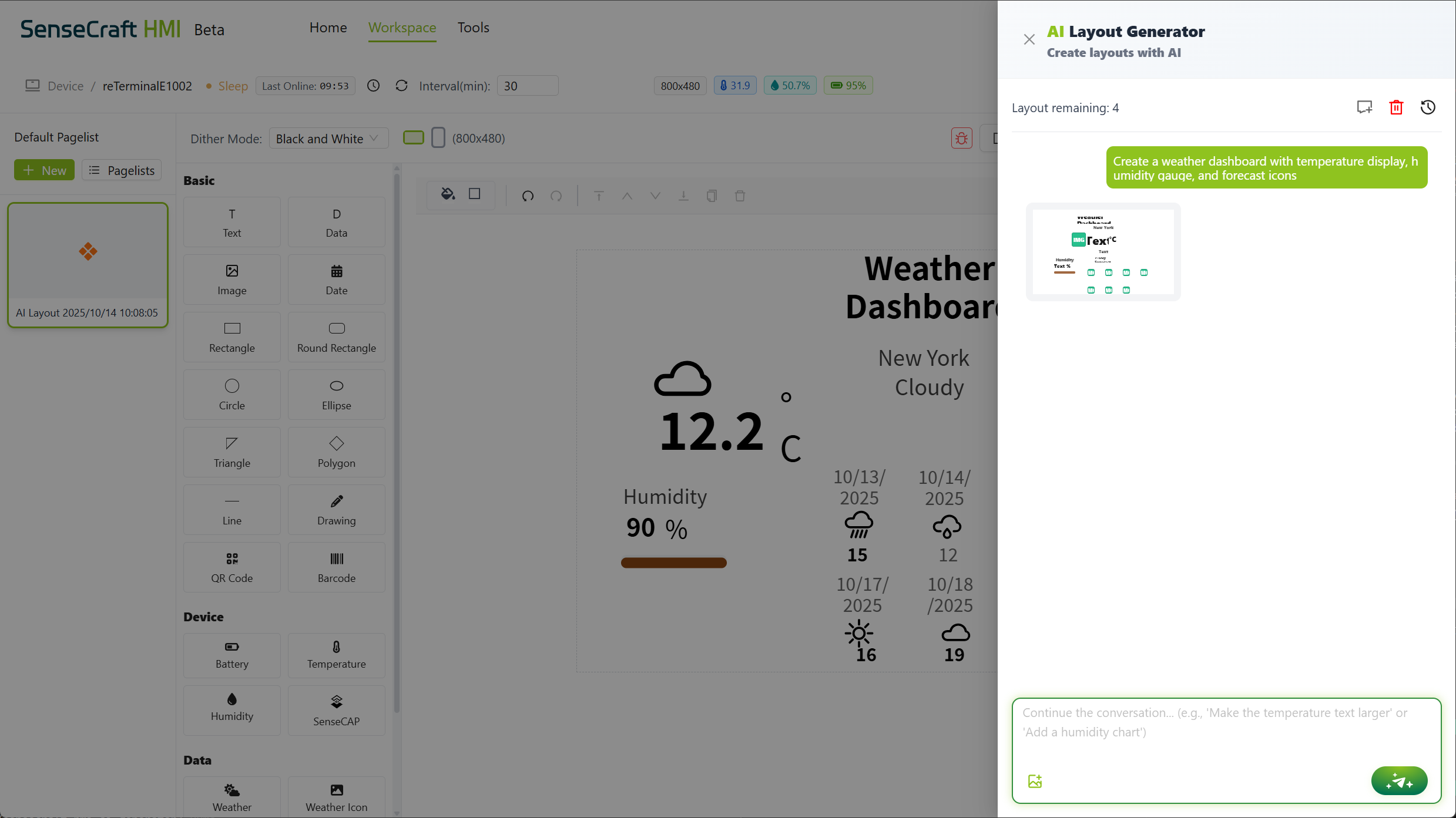 Section titled “Introduction”SenseCraft HMI is Seeed Studio’s interactive interface design platform specifically created for screen-based products. One of its most powerful features is the AI Generation function, which allows you to create beautiful display layouts and images by simply describing what you want in natural language.