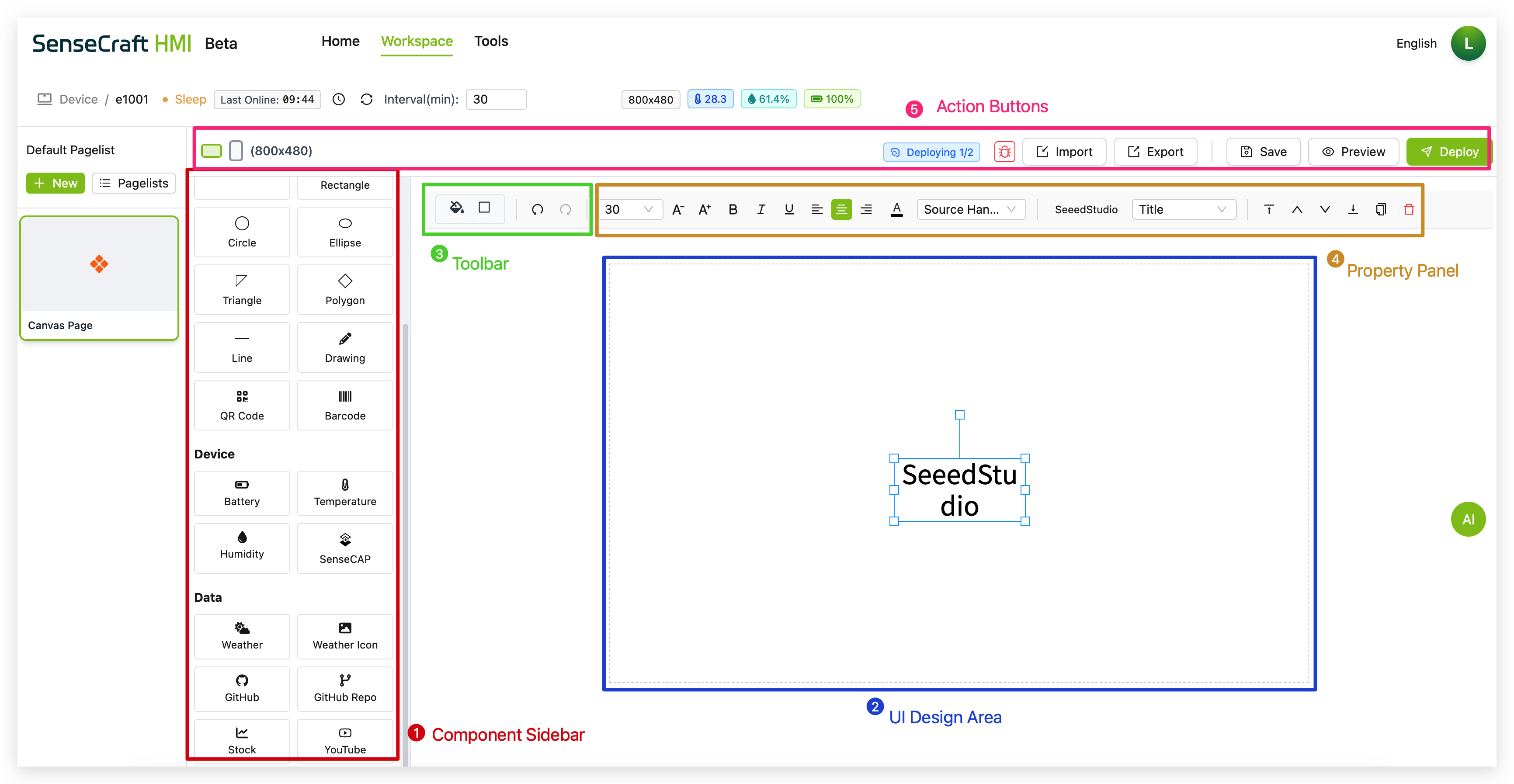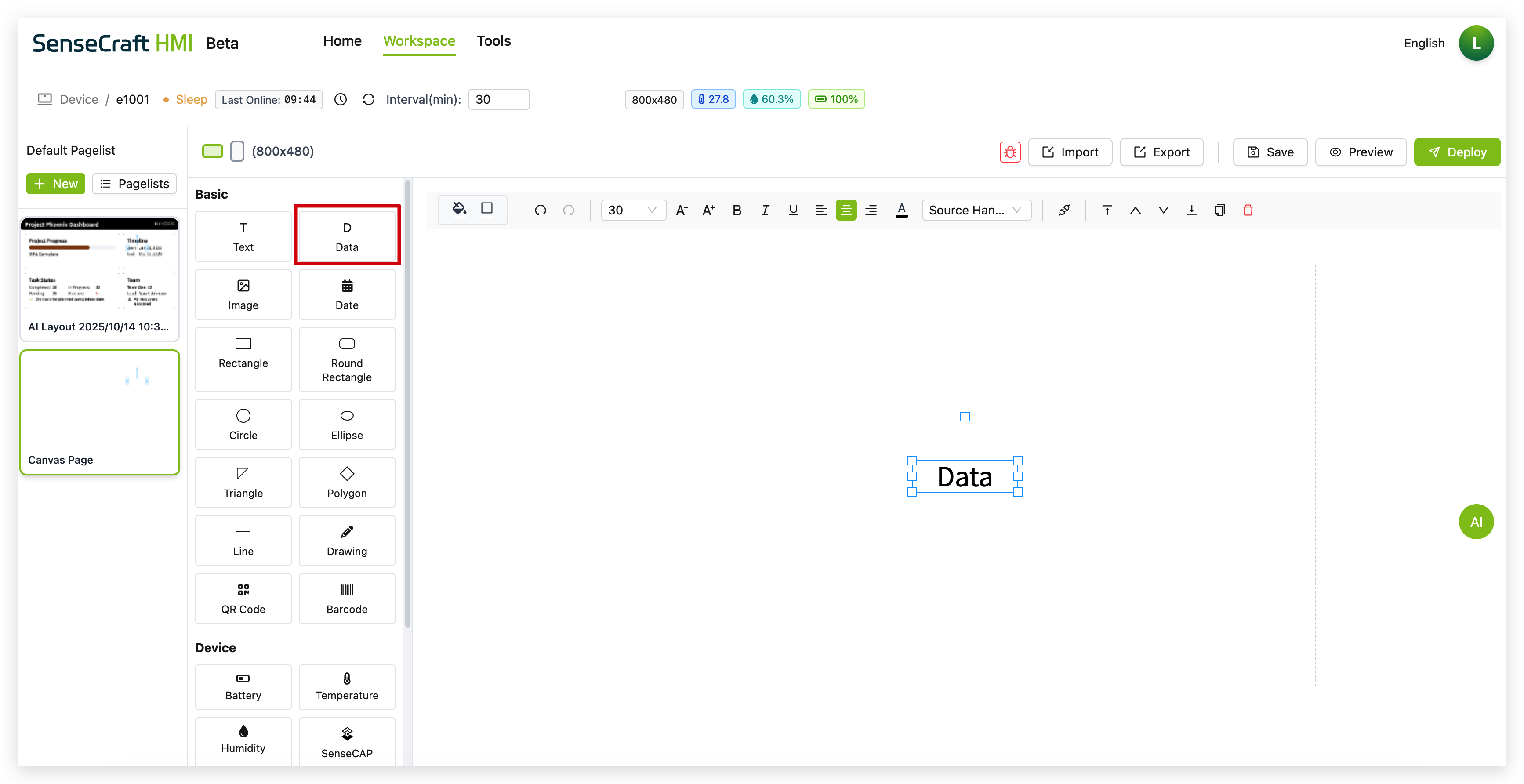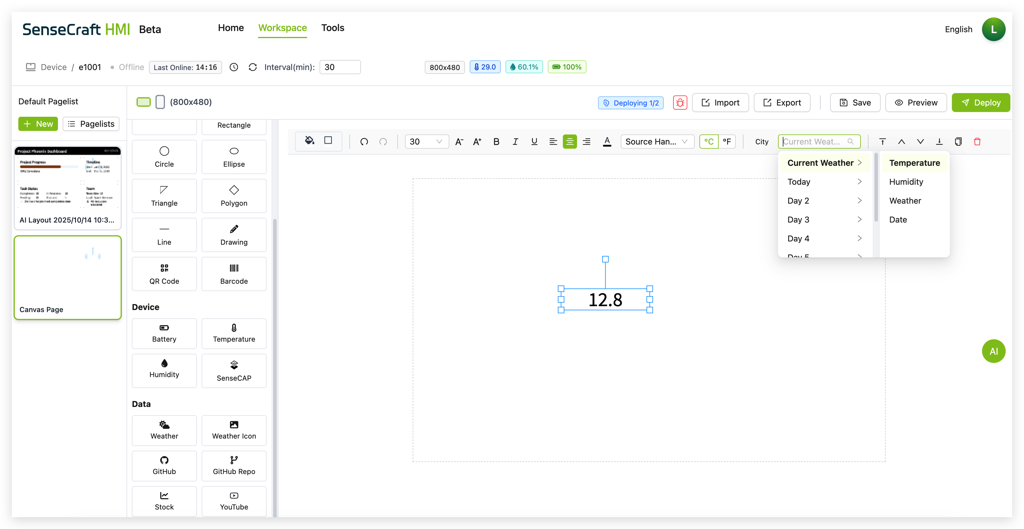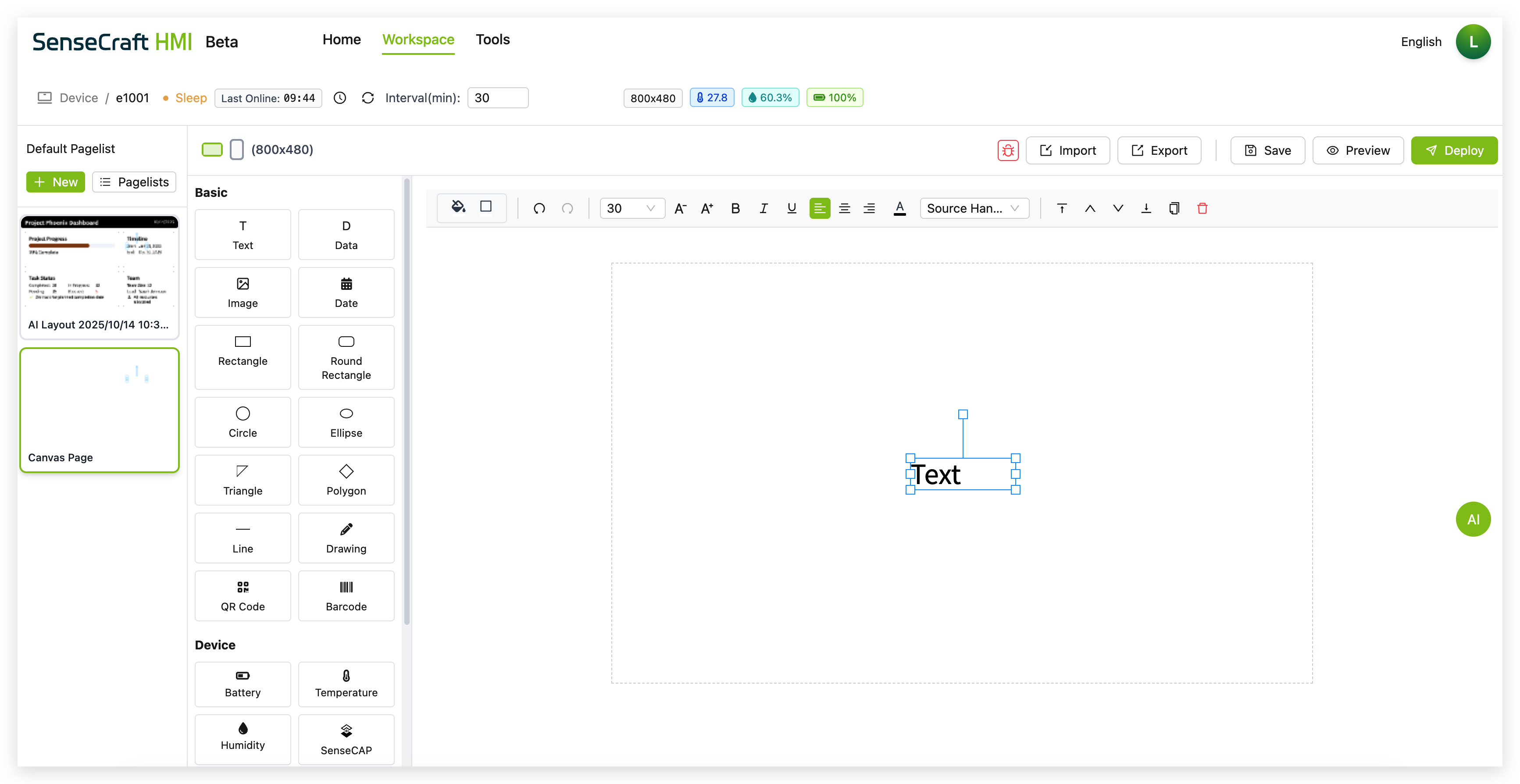 Section titled “Introduction”The UI Design function in SenseCraft HMI is the most powerful and flexible feature of the platform, allowing you to create custom interfaces, dashboards, and data visualizations. With Canvas, you can design beautiful displays that combine static elements with dynamic data from various sources, including device sensors, weather information, stock data, and more.