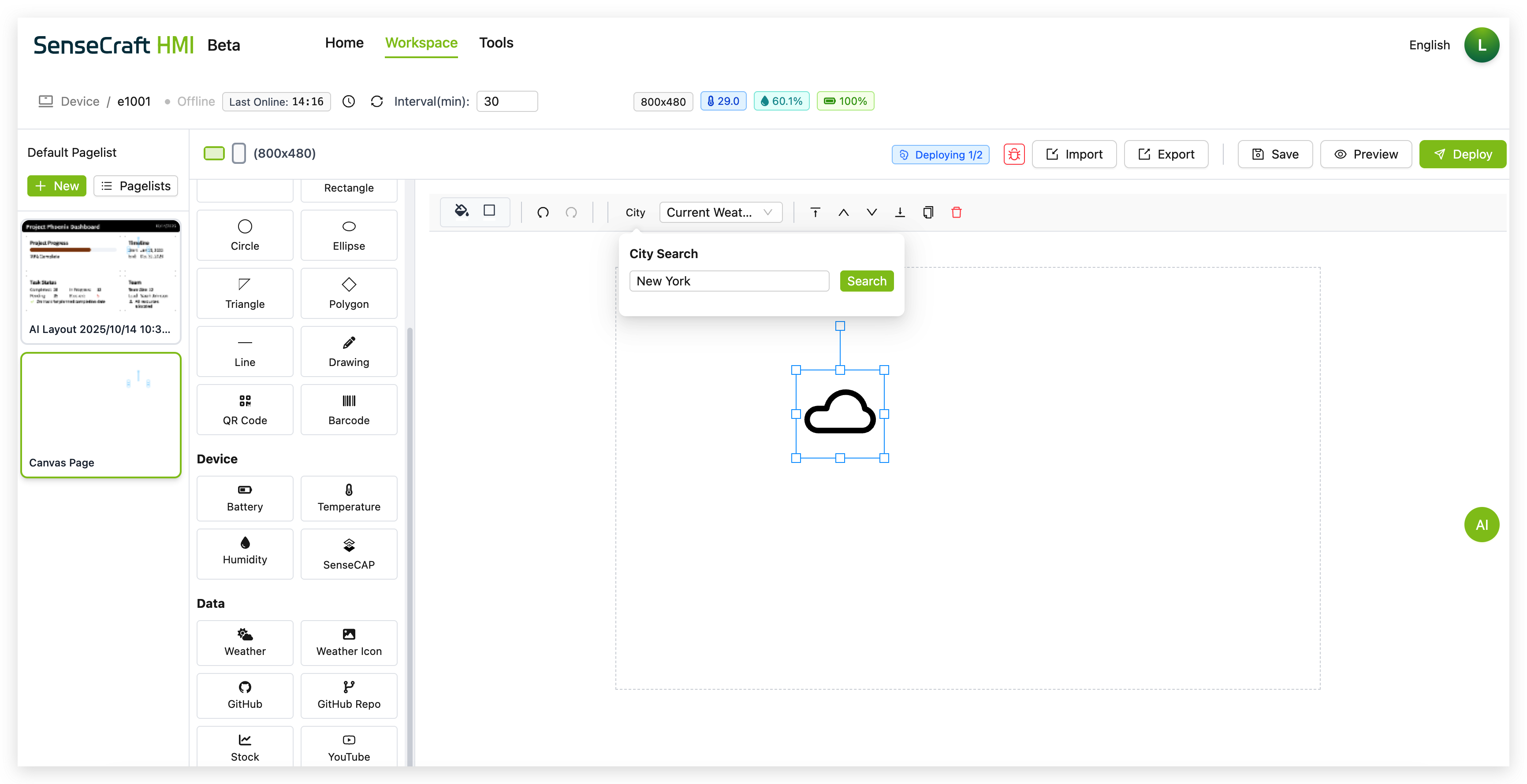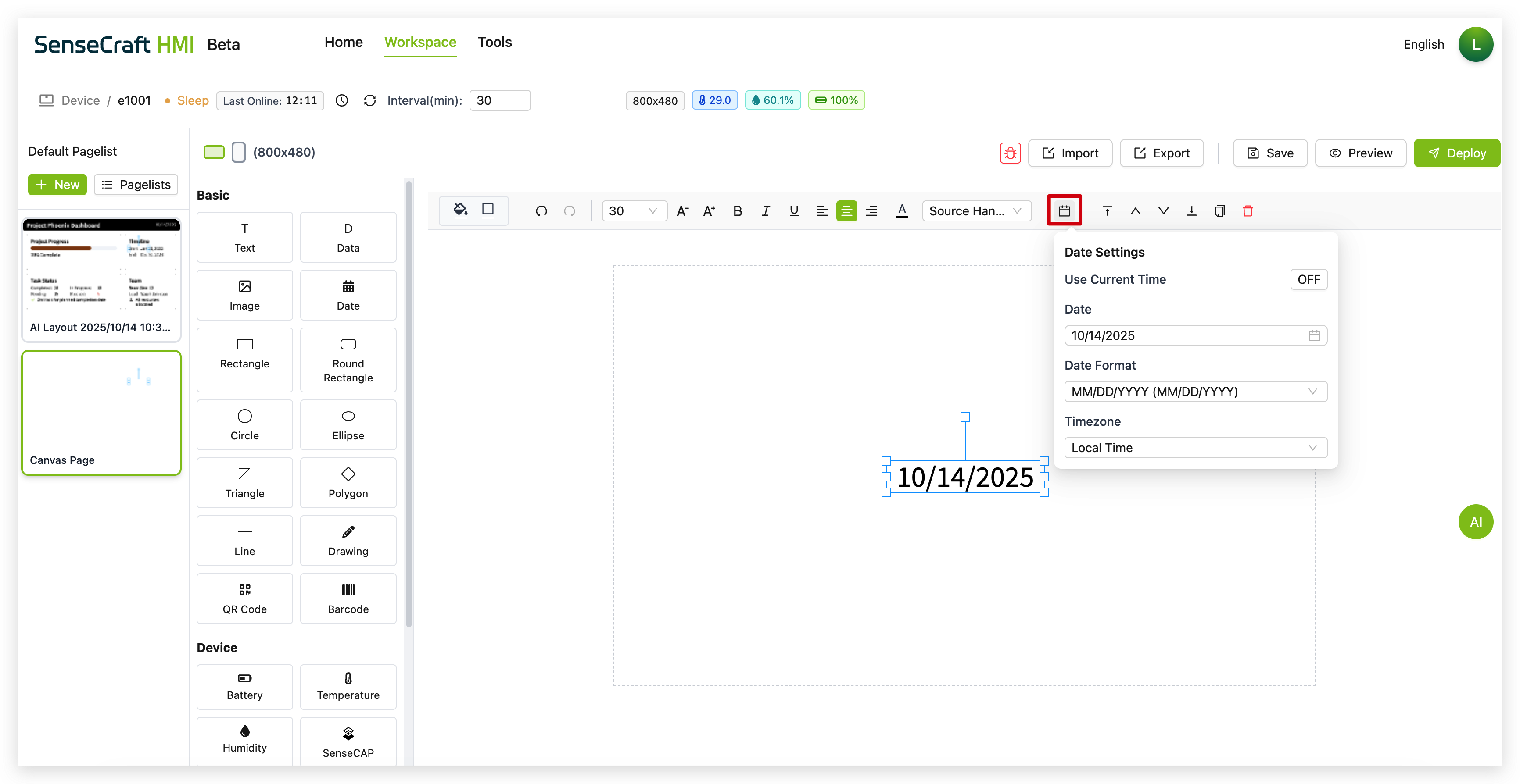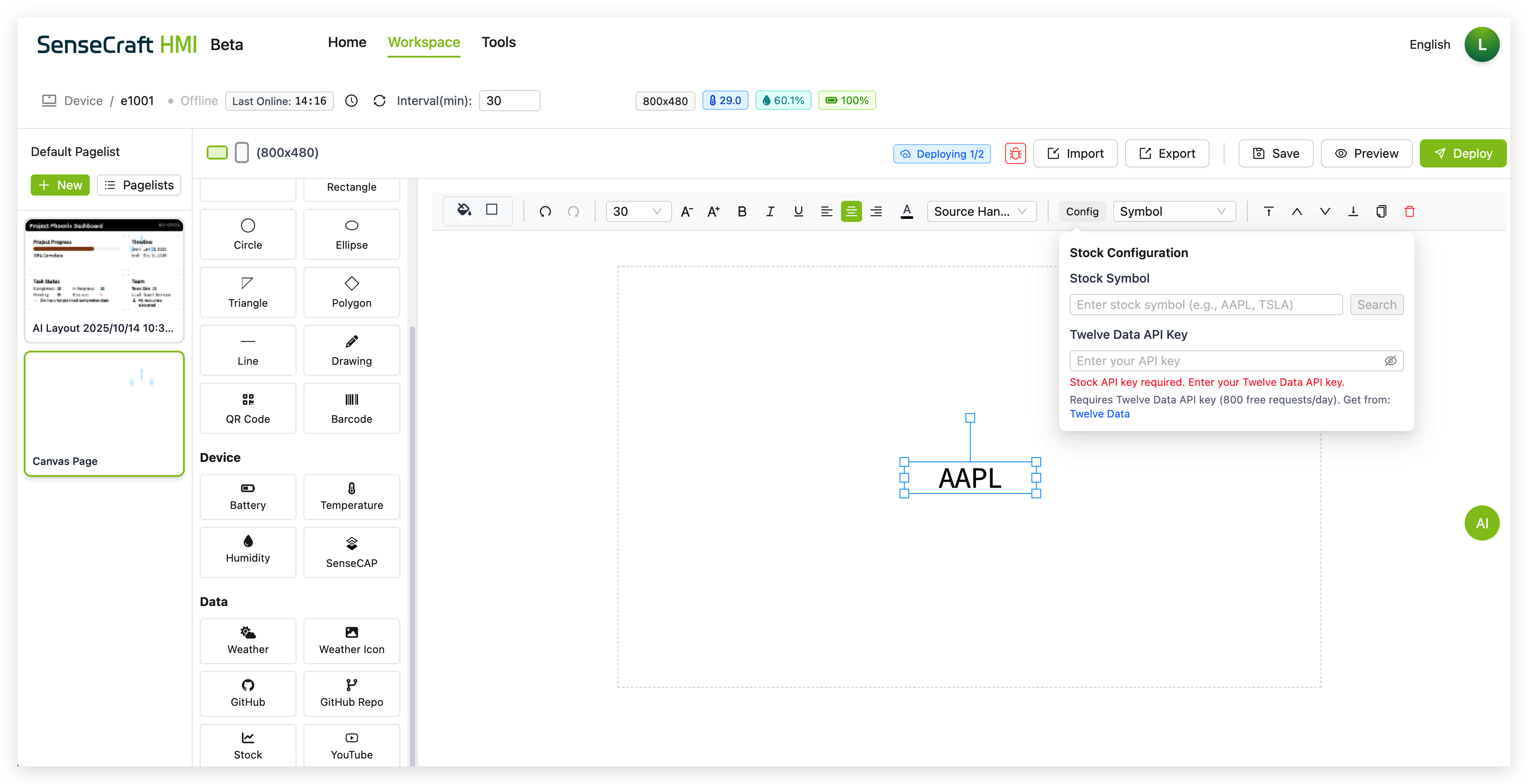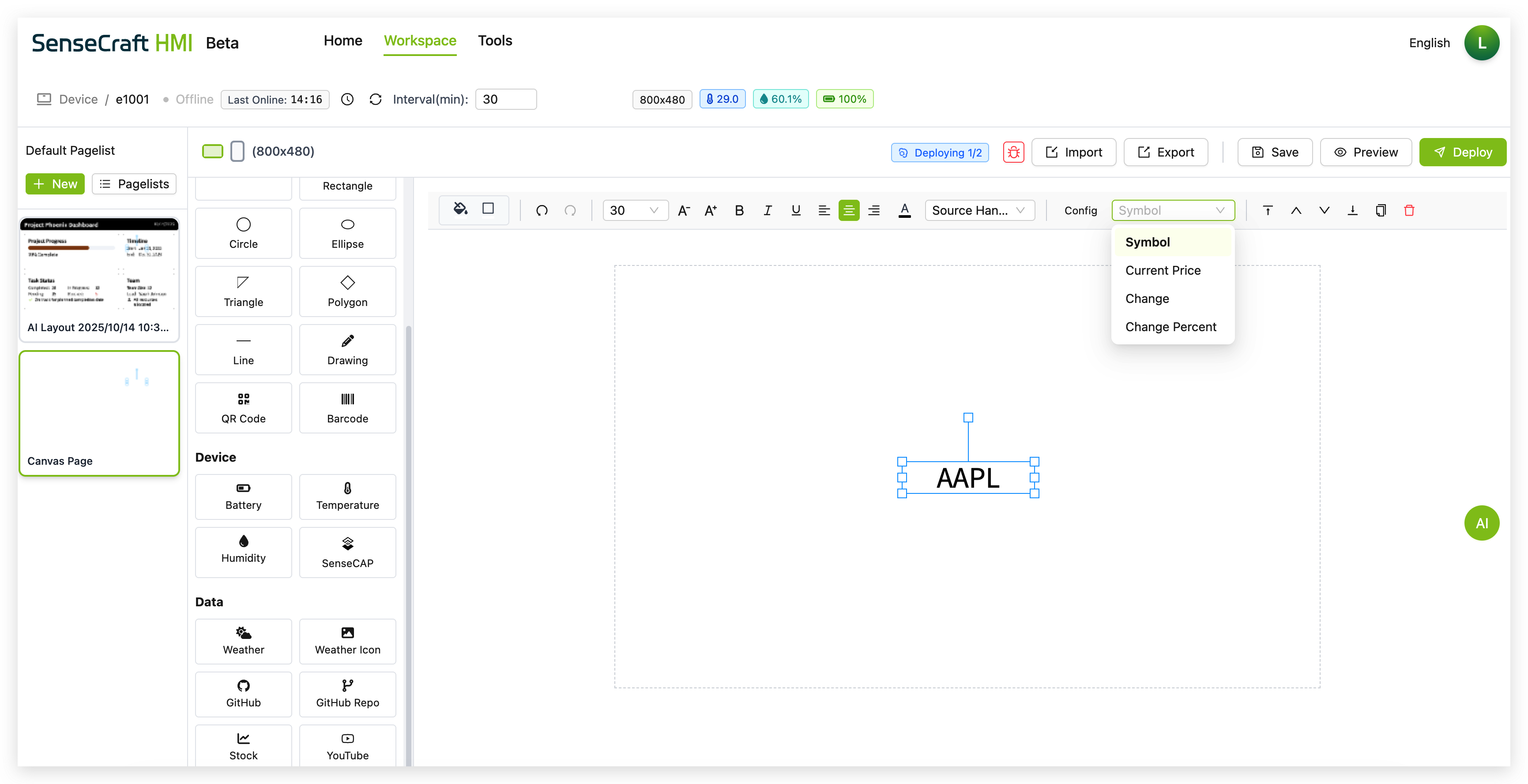 Section titled “Introduction”The UI Design function in SenseCraft HMI is the most powerful and flexible feature of the platform, allowing you to create custom interfaces, dashboards, and data visualizations. With Canvas, you can design beautiful displays that combine static elements with dynamic data from various sources, including device sensors, weather information, stock data, and more.