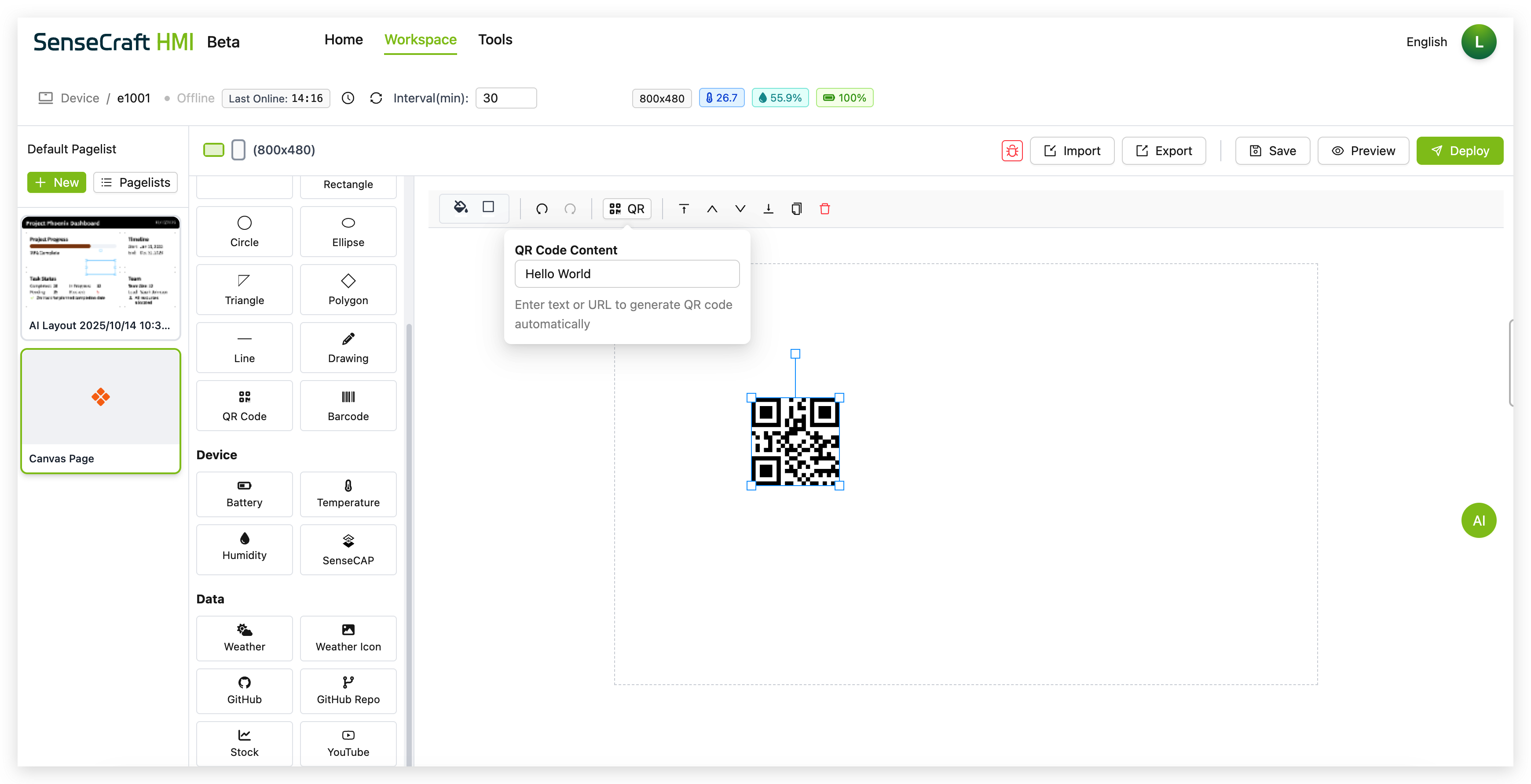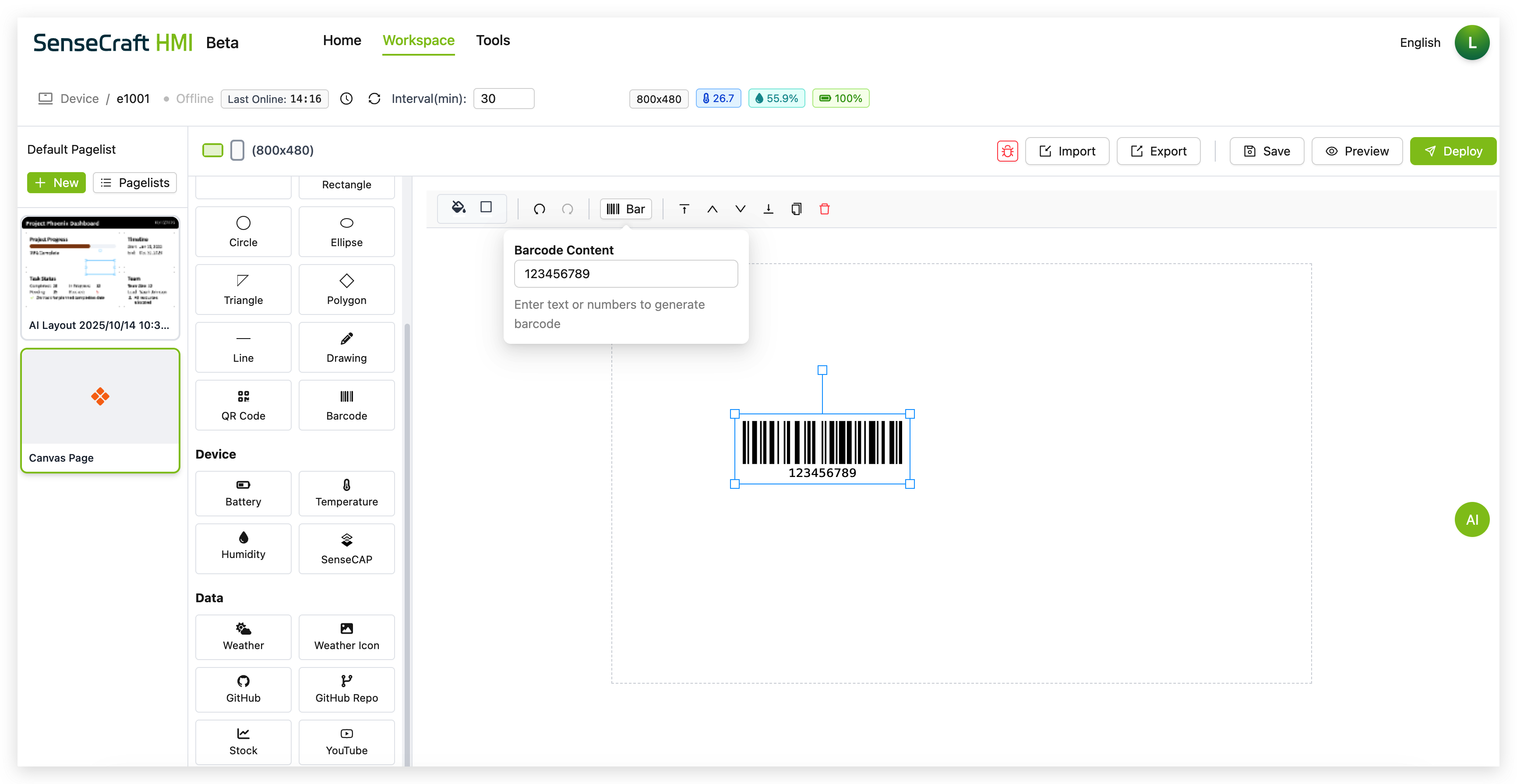 Section titled “AI Layout Generator”SenseCraft HMI Canvas includes an AI-powered layout generator: