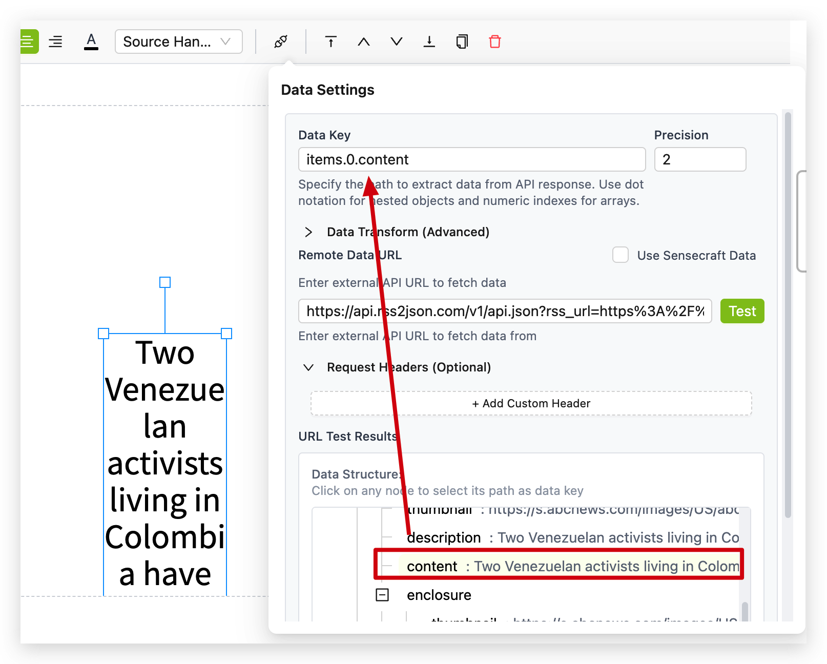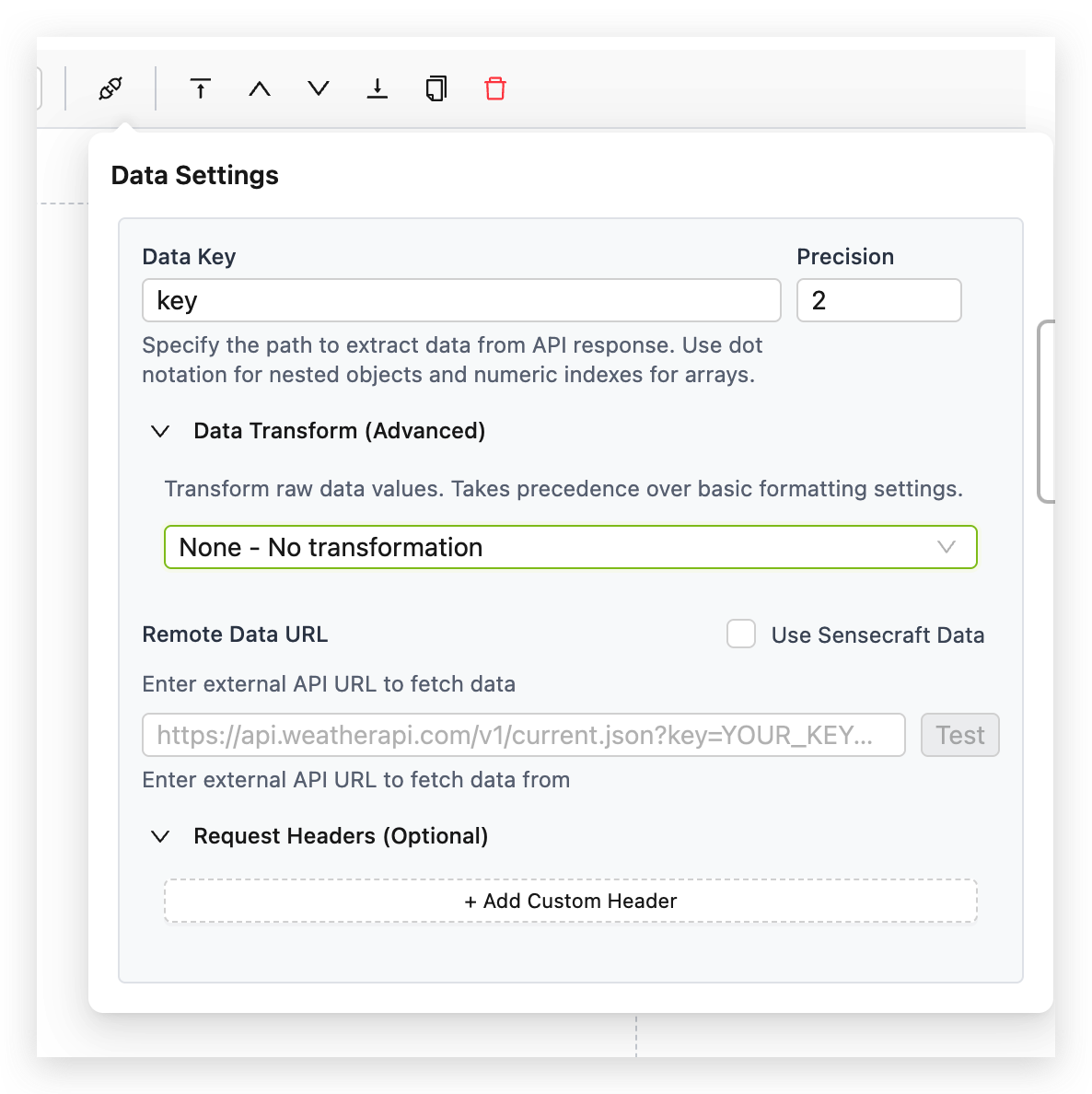 - Data Key: Use dot notation to specify the exact path to the data you want to display. If your API returns