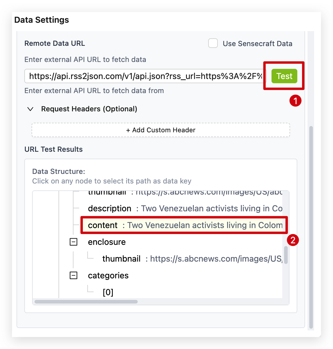 - Request Headers (Optional): Some APIs require authentication via headers. Use the + Add Custom Header button to add necessary keys and values, such as an