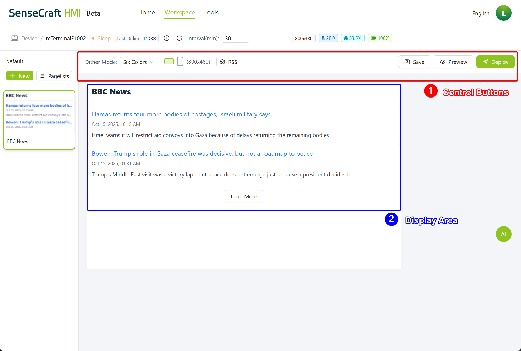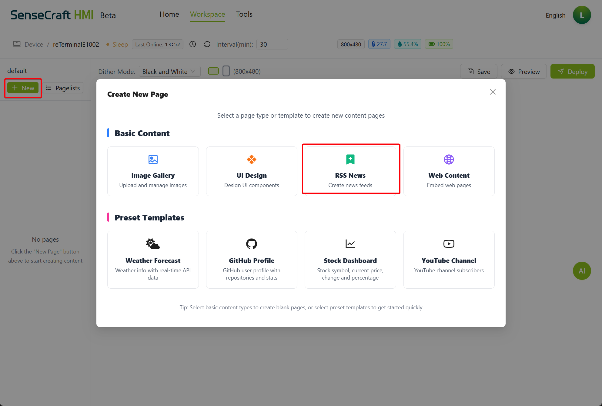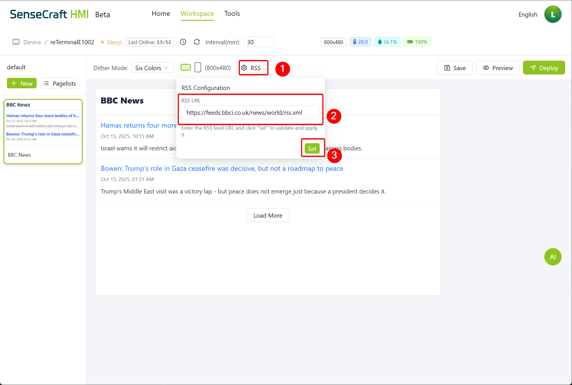 RSS feeds allow users to stay updated without having to visit each website individually. Instead, new content is automatically delivered to your RSS reader or, in this case, your SenseCraft HMI-enabled device.