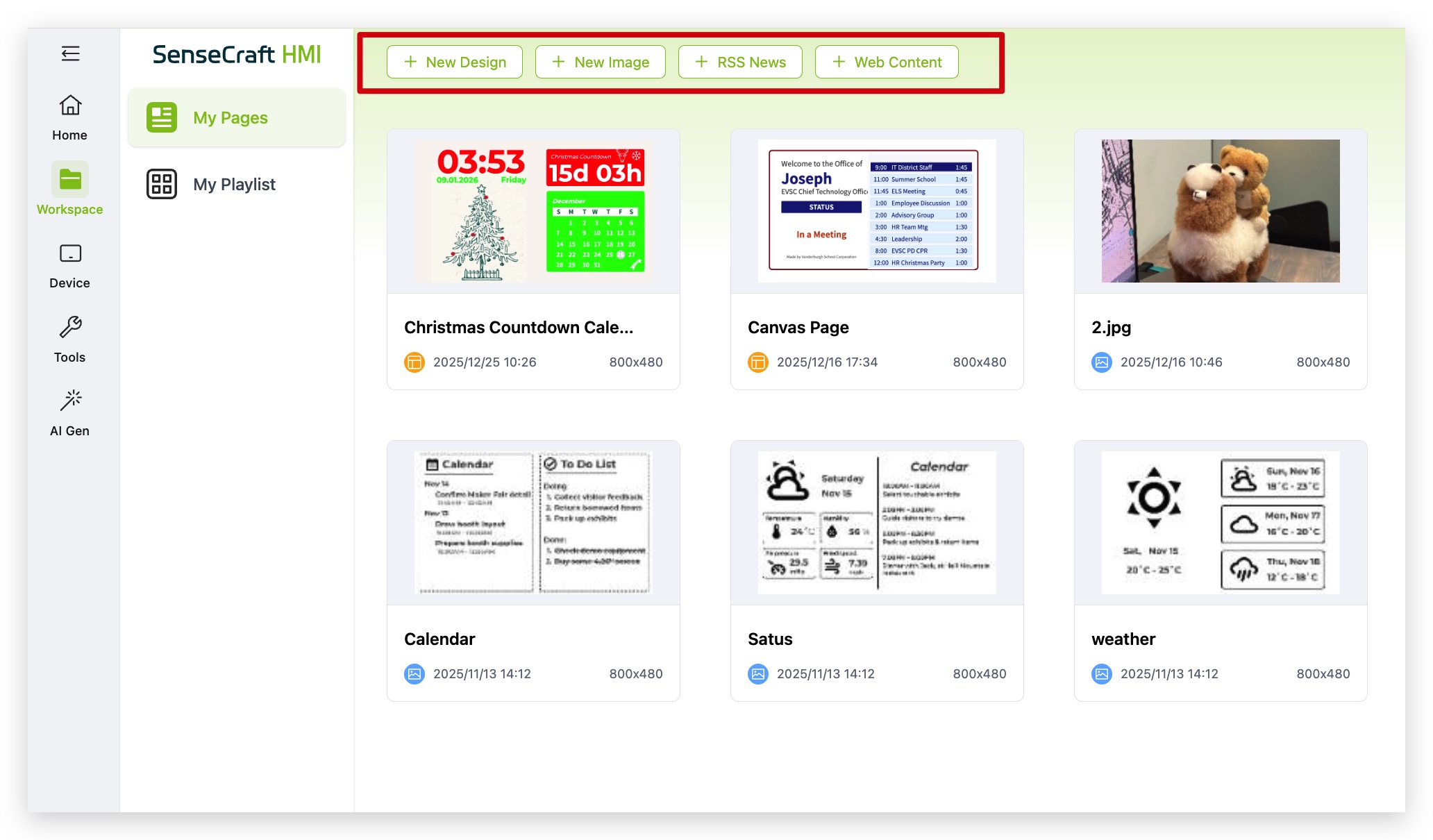 Section titled “Getting Started”At the top of the Workspace page in the SenseCraft platform, you will see four core modules: New Design, New Image, RSS new, and Web Content. These modules allow you to create rich content and interactive interfaces.