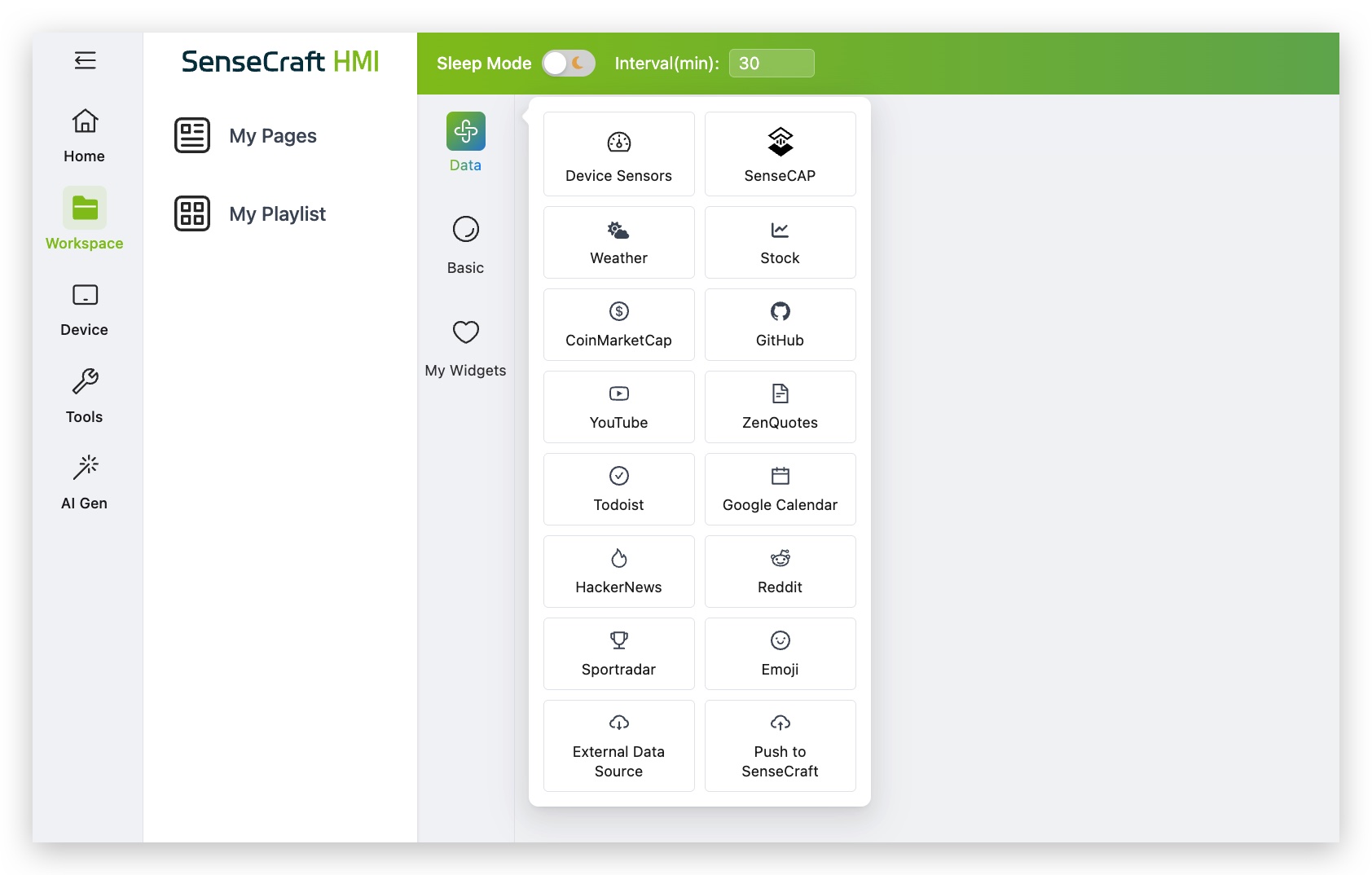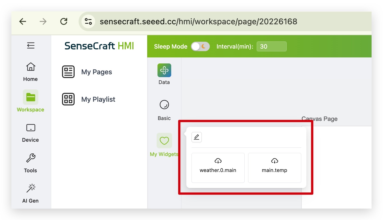 This guide focuses on the New Design module, specifically the Data section. This is one of the standout features of SenseCraft, allowing you to easily link external data. Whether using our provided standard application data interfaces or custom data sources, you can build powerful visual dashboards.