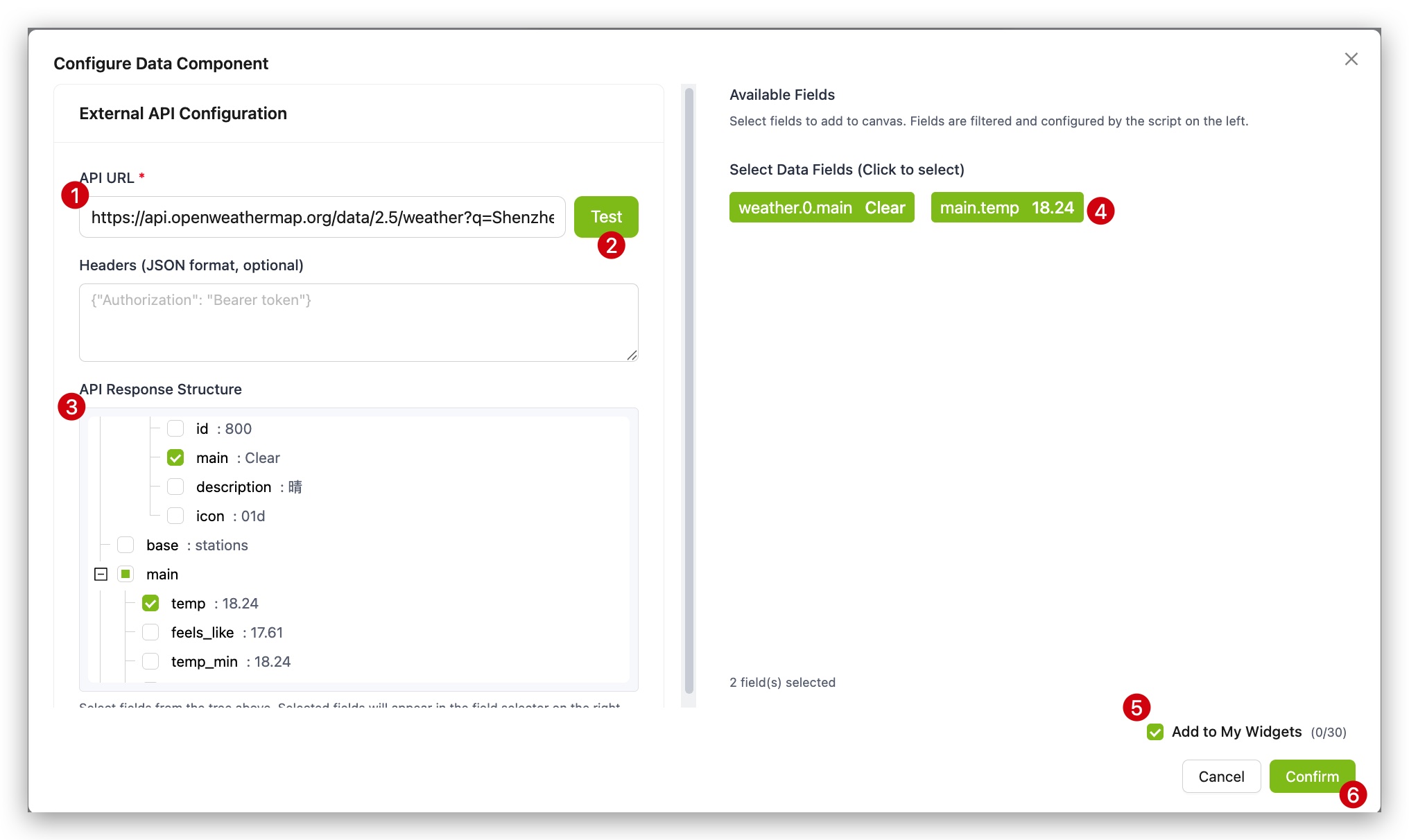 Step 2. Enter the API address (URL) from which you want to fetch data into the component configuration box.